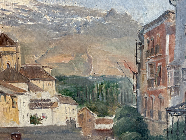 Desde ese momento me propuse conocerla in situ y ha sido un objetivo conseguido hace poco, lo que me permite escribir sobre ella con una intención que no es otra que la de darla a conocer, porque merece ser conocida. Sería más valorada en Granada que en Málaga, pero el coleccionismo privado tiene estas cosas: en el Museo Carmen Thyssen cohabita con escenas costumbristas sevillanas, con marinas diversas, con la madrileña Puerta del Sol (de Enrique Martínez Cubells),… y, muy posiblemente, solo los granadinos nos fijemos lo suficiente en ella.
