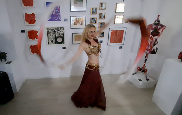 El público asistente rodeado de acuarela, óleos, acrílico, cerámica artística y esculturas de todos los tamaños fue sorprendido con un doble espectáculo. En primer lugar el de Helena Rull que se hizo esperar un poquito. Esta profesora y coreógrafa de danza oriental sorprendió accediendo desde la calle hasta llegar a un rincón del espacio donde llevar a cabo gran parte de su espectáculo. Previamente Marijose indicaría que Helena es una de las pioneras en esta disciplina en Andalucía y cómo ha recorrido con su danza varios países como India, Portugal, Líbano y Marruecos y que es propietaria de una tienda cercana a la galería además de dar clase de esta modalidad de danza.