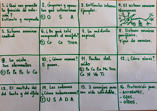 Una vez terminada la situación de aprendizaje, muy especialmente en temas de ciencias, procederemos a la confección de una técnica de estudio bautizada como el T16, (el truco de las 16 preguntas). El docente, junto a su alumnado elaborará una serie de preguntas relacionadas con el tema recién estudiado y explicado, en concreto serán 16 preguntas. Están surgirán como resultado de cuatro dobleces a la mitad de un folio al uso, hasta obtener una cuadrícula de unos 5 centímetros de largo por 3 centímetros de alto. Al abrir el folio, como resultado se visionarán 16 casillas en blanco listas para ser rellenadas con preguntas alusivas al tema. Éstas serán respondidas en sus correspondientes libretas de ciencias y les servirá para estudiar tanto el examen oral (una de esas preguntas tendrá que ser respondida al elegirla al azar) como el escrito, pues al saberse cada uno de los puntos que compone el tema se verá capacitado para responder sin problema, pues los conocimientos adquiridos serán extrapolables a los necesitados en el examen escrito.