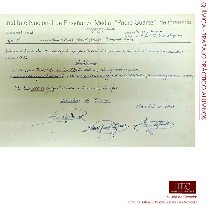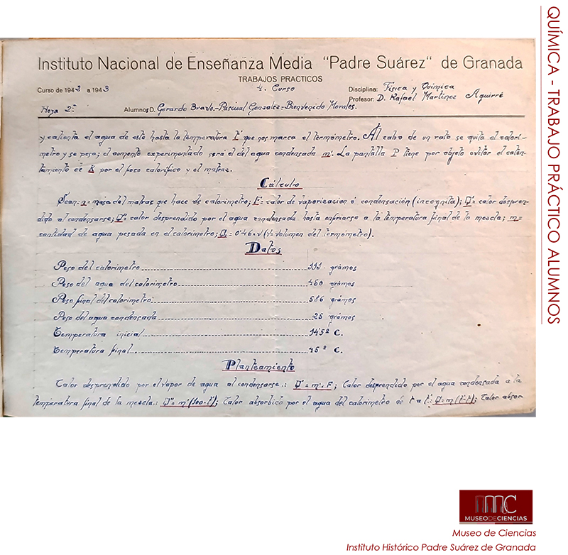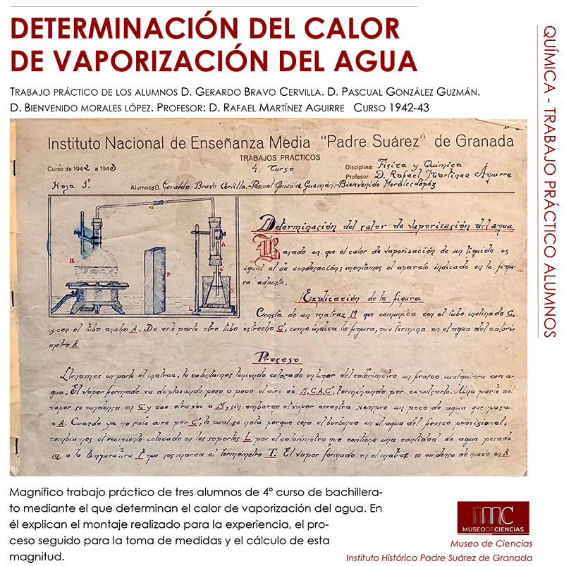 El calor de vaporización del agua es la energía necesaria para transformar agua líquida en vapor a 100º C y a 1 atmósfera de presión. Tres alumnos del Instituto Padre Suárez de Granada lo determinaron, tal y como explican en este trabajo del curso 1942-43 que nos presenta José Emilio Padilla, responsable de su Museo de Ciencias.