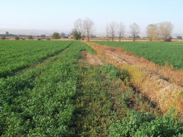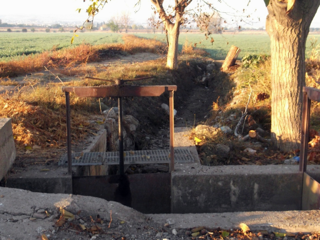 Después del breve comentario de las higueras y de los frondosos nogales —ahora me urge avanzar—, nos encontramos con un nuevo paisaje. Como imaginaréis, ya no existe la vereda que tantas veces cruzamos mis hermanos y yo con nuestra BH y todas las herramientas de labor al hombro hasta llegar, lo más pronto y salvos, al haza del río. En su lugar, han levantado un caballón de tierra que divide dos fincas sembradas de grandes campos de alfalfa para alimento del ganado. El inicio de la vereda estaba justo aquí, en esta distribución de compuertas —antes solo había compuertas en la Acequia Gorda—, que ahora me ofrece asiento y algo de sombra. Así que, bueno, aprovecharé este improvisado descanso para deleitarme con mis recuerdos en la lejanía del paisaje.
