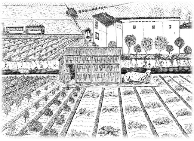 Yo solamente lo vi cruzar la carretera desde la choza y coger la vereda prohibida por el guarda Pajares o por el dueño de aquella fila de membrillos que se ven al fondo del dibujo, muy apreciados por todos nosotros y los chiquillos del Barrio. Por la distancia que había desde la choza a la vereda, pude comprobar que él no pasó del primer olivo y el único que yo recuerde; era la estación del año donde los olivos están en flor y los gorriones nuevos, aún son volantones. Por este motivo el olivo al ser un olivo solitario estaba cuajado de pajarillos indefensos que con sus boqueras amarillas reclamaban urgente a sus padres las semillas más tiernas de los trigos veraniegos. Muchos de ellos todavía guacharros, sin haber abandonado el nido que con tanta seguridad habían construido sus padres camuflados entre las horquillas fuertes de sus espléndidas ramas.