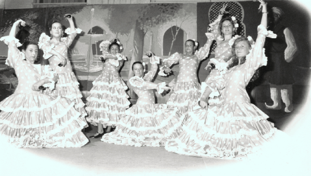 Para mí fue una verdadera sorpresa que también me llenó de orgullo. El encontrarme con Adora sentada entre los componentes de la mesa, con su mantón de manila sobre sus hombros, su clavel rojo prendido en el pelo y su banda cruzada con el nombre de «presidenta de la Comisión de Fiestas».