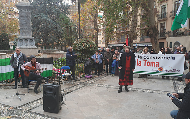 Un año más, y van 30, en los que diversas asociaciones integradas en la Plataforma Granada Abierta reivindican una celebración alternativa a los de la Toma, organizados por el consistorio. Como en las últimas ediciones, se llevó a cabo en la plaza de la Mariana donde, según los convocantes, se congregaron entre 250 y 300 personas que pudieron asistir a un acto que tuvo como protagonista la poesía y la música. El primero en intervenir sería el periodista y coordinador de la Plataforma, Paco Vigueras, quién denunció que «la Toma se ha convertido en una celebración anacrónica, sectaria y excluyente, insostenible en democracia». Y todo ello «en una ciudad como Granada, que vive de la Alhambra, convertida hoy en Patrimonio de la Humanidad y que aspira a ser Ciudad Europea de la Cultura», al tiempo que reivindicaba que el 2 de enero se convierta «en un encuentro de todas las culturas que han contribuido a la prosperidad de Granada a lo largo de los siglos».