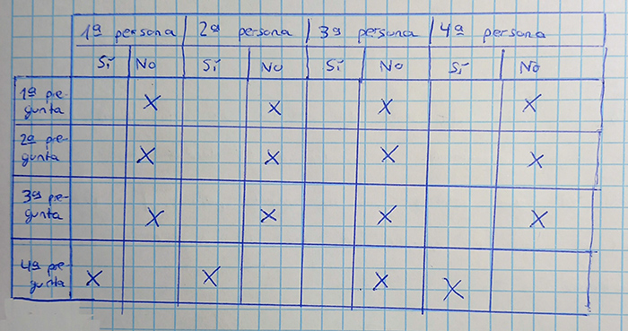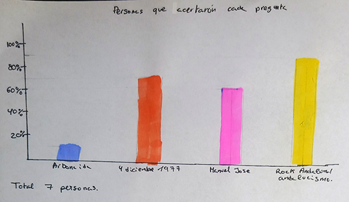 A todo ello se suma que el alumnado de 4º de ESO llevó a cabo una breve encuesta realizada a diversos profesores y profesoras del centro de diferentes materias, con el objeto de constatar el grado de conocimiento de ciertas cuestiones esenciales que se tratan en esta actividad. El ejercicio consistía en realizar cuatro preguntas al profesorado, elegido aleatoriamente, y vaciar el resultado de las respuestas en una gráfica. Las preguntas y los resultados en cuestión fueron las siguientes: