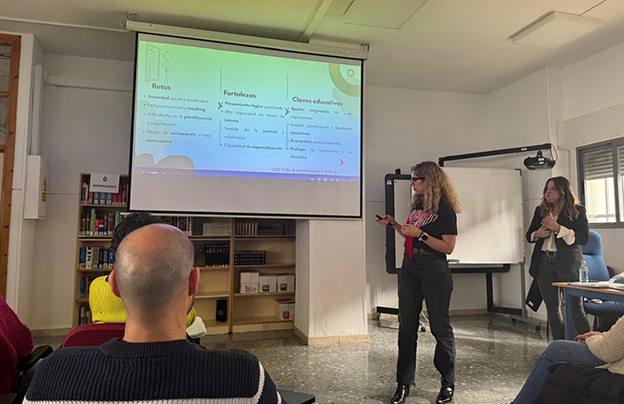 Las jornadas se estructuraron en tres partes diferenciadas. La primera, desarrollada por Nieves Dionisio, orientadora especialista en TEA del EOE Especializado de Granada, se enfocó al establecimiento de un nuevo marco de actuación desde la neurodiversidad, aportando estrategias generales y desmontando mitos. Su intervención incluyó el testimonio real y las experiencias de un alumno con necesidades educativas especiales asociadas a TEA que cursa tercero de la ESO en un instituto granadino. El alumno enfatizó la importancia de los apoyos recibidos en su proceso de escolarización (escolares, familiares, asociaciones, etc.), sus experiencias sociales en las actividades complementarias y la necesidad de más tiempo en los exámenes.