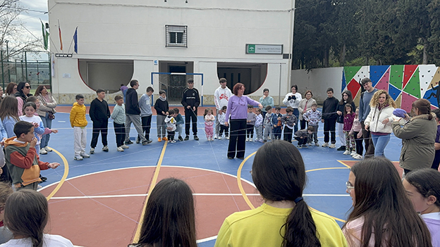 Posteriormente, toda la comunidad educativa se trasladó a la pista polideportiva del colegio. Allí, formando un gran círculo, se realizó una dinámica de cohesión grupal en la que cada participante compartía una frase relacionada con la igualdad de género mientras pasaba un ovillo de lana a otra persona. De esta manera se fue creando entre todos una gran «tela de araña», símbolo de unión, respeto y colaboración entre todas las personas, independientemente de su género.