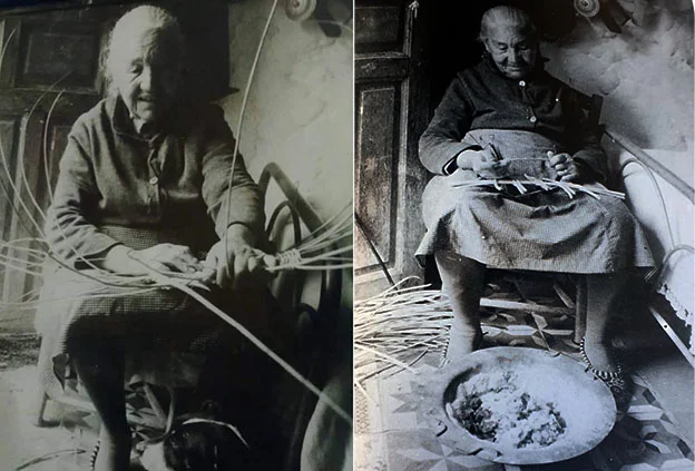 A la derecha, mamá Trinidad – a ver, repítenos, Trinidad era… ¿tu bisabuela?-, la canastera. Aparece con un recogido, un moño de pelo blanco, delante de un brasero de cisco carbón y cisco picón. Manos poderosísimas trenzando el culo de una canasta.