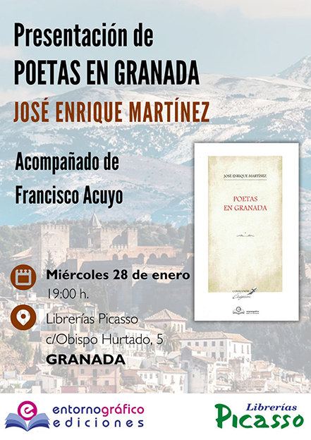 La presentación del libro ‘Poetas en Granada’ se llevará a cabo en Librería Picasso, (C/ Obispo Hurtado, 5,) el miércoles, 28 de enero, a partir de las 19 h.