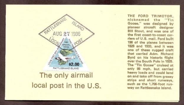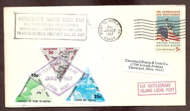 Fue así como la isla de Rattlessnake decidió prestar un servicio de correo con la otra isla: Ohio [ambas vecinas y en el mismo lago] y el 26 de agosto de 1966 inauguraba sus emisiones: rápidamente contestadas desde el USPS: nada de formato rectangular para esas piezas y, si se colocaban en la red postal, debían ir en el lado izquierdo del envío [eligieron esa posición en la parte inferior del frontal correspondiente]; el objetivo era evitar considerar esos envíos franqueados cuando se reencaminaban a través de la la USPS que tiene [¿tenía?] la exclusividad de poder emitir los signos postales correspondientes, al menos hasta que decidieron cargarse el legado histórico de la Unión Postal Universal y comenzaron a dejarnos sin servicios postales en medio mundo.