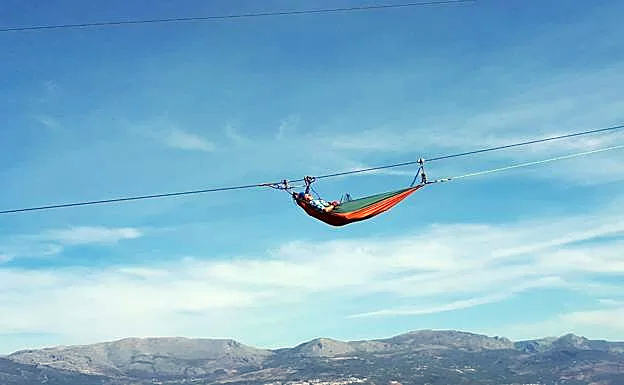 La empresa Vive Aventura ofrece en Comares la posibilidad de pernoctar en una hamaca colgada de una vertiginosa tirolina. Para ello el profesor de la Facultad de Ciencias del Deporte, Justino Cebeira contó con dos alumnos voluntarios (Miguel y Brais). Los tres pasaron la noche del 8 al 9 de junio en hamacas colgadas de la tirolina. Eso sí, con las pertinentes medidas de seguridad, por las que cada uno de ellos también estaban unidos al cable desde sus respectivos arneses. Era la primera vez que se practicaba el ‘highline’ en grupo en toda España.