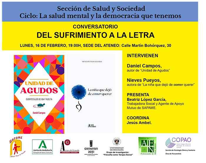 El Ciclo será inaugurado por Indalecio Sánchez-Montesinos, Delegado de Salud y Consumo de la Junta de Andalucía y cuenta con la colaboración del Grupo de Investigación “Filosofía como Terapia Social” de la Universidad de Granada, de la sección de Andalucía de la Asociación Española de Neuropsiquiatría, del Área de Psicoanálisis del Colegio Oficial de Psicólogos, de la Sede de Granada de la Escuela Lacaniana de Psicoanálisis y de la Asociación SAPAME (Salud Para la Mente) de Granada.