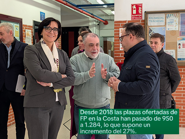 En este sentido, ha recordado que desde 2018 las plazas ofertadas de FP en la Costa han pasado de 950 a 1.284, lo que supone un incremento del 27%, mientras que el alumnado matriculado ha crecido cerca de un 40%, y el número de ciclos se ha incrementado en un 72%, con la implantación de 13 nuevos ciclos y un curso de especialización en los últimos seis años.