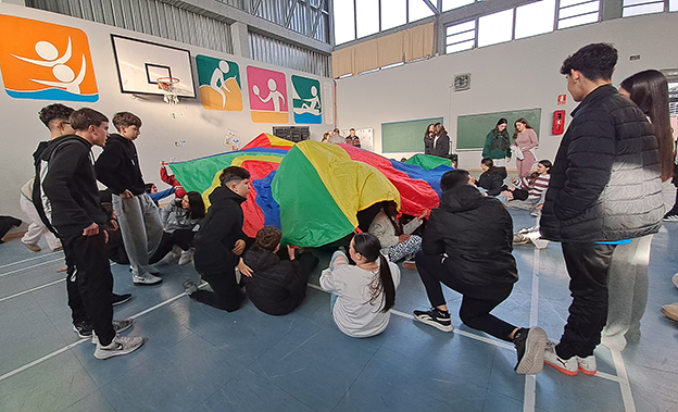 Es una efemérides poco conocida aunque de gran relevancia, especialmente para aquellos institutos preocupados con la convivencia y la resolución de conflictos de una manera dialogada llevada a cabo por sus propios compañeros. En la jornada del miércoles, 21 de enero, muchos centros granadinos que cuentan con el programa de mediación escolar celebraron el Día Europeo de la Mediación de un manera muy especial, que en el IES Pedro Soto de Rojas se materializó con un encuentro con otros dos centros, el IES Alhendín y el IES Alonso Cano, para mejorar la formación y compartir experiencias en una actividad perfectamente organizada que comenzó a primera hora de la mañana. Cuando llegamos la vicedirectora del Soto de Rojas, megáfono en mano, explicaba la actividad ‘Paracaídas’ que se desarrollaba en el gimnasio donde los alumnos de los tres centros se habían distribuido en los diferentes grupos y realizaban juegos para romper el hielo, conocerse, compartir sus aficiones e inquietudes mediante actividades de movimiento y música.