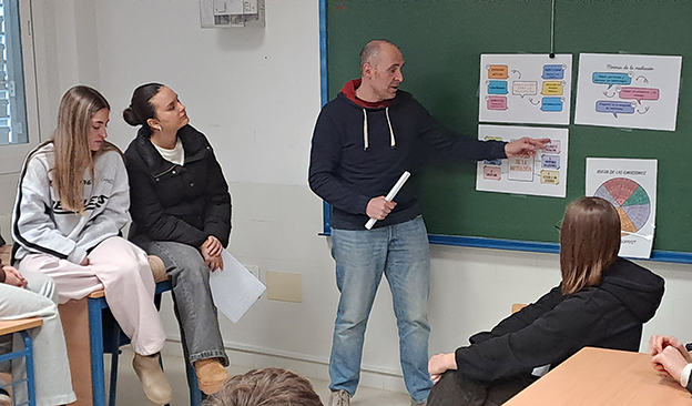 Igualmente Martina Jiménez, del IES Alonso Cano, lleva varios cursos haciendo mediación «y la verdad es que es una actividad que está muy bien pues así pueden aprender a solucionar sus propios problemas». Por su parte, Juan Luis García, estudiante de Integración Social en el Soto de Rojas contaba que lleva dos cursos trabajando en el ámbito de la mediación y que actividades como la celebrada es importante para darle visibilidad a este tema. Vanessa, orientadora del IES Alhendín explicaba que es su centro vienen impartiendo formación reglada con un grupo de alumnado con capacidad para la mediación y que el curso pasado hicieron un trabajo en red con otros centros de la zona. La orientadora del instituto de Dúrcal, Araceli Bueno, informaba que su centro llevan trabajando en mediación desde 2013, cuando se comenzó a trabajar la formación tanto de profesores como de alumnado e incluso de las familias y que en la actualidad son José y Antonio, sus compañeros de FP Básica y de Bienestar Emocional los que lo coordinan. «El impacto de la mediación en el centro ha sido grandísimo a todos los niveles, a la hora de aprender los niños a solucionar los conflictos de una manera dialogada. De hecho a nivel estadístico tenemos las gráficas que demuestran cómo ha ido bajando y cómo ha mejorado la convivencia».