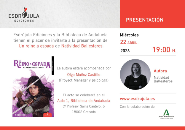 El día 22 de abril llevará a cabo la presentación oficial de ‘Un reino a espala. Libro 1’ (Esdrújula Ed.) en la Biblioteca de Andalucía a las 19:00 (Aula 1) donde estará acompañada por la psicóloga, Olga Muñoz. Así mismo en la Feria del Libro firmará ejemplares el 24 abril, 11:00 – 14:00 h; 29 abril, 11:00 – 14:00 h y 30 abril, 19:00 – 20:30 h. Los días 25 y 26 de abril firmará ejemplares en Ficzone (sábado 25 de 12:30 a 13:30 / domingo 26 de 13:30 a 15:00 h). Además de eso, en Ficzone el 25 sábado, mantendrá un coloquio junto a su editora Mariana Lozano, acerca de: cómo construir una saga de fantasía hoy (de 11:30 a 12:30 h).