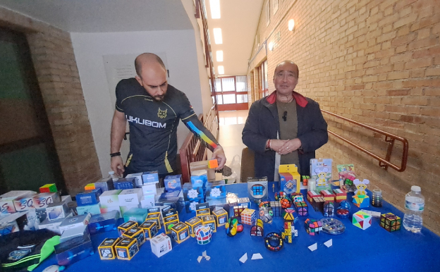 Junto a la entrada encontramos a Antonio Gallego, un gran aficionado y coleccionista -afirma tener cerca de 500 cubos y variantes en su domicilio-, que nos va mostrando algunos de los más curiosos como el Rubik Mirror, la bola de Rubik, otros tuneados, el Super Square One, uno de los más modernos; la torre de Babel, el Void Cube,…