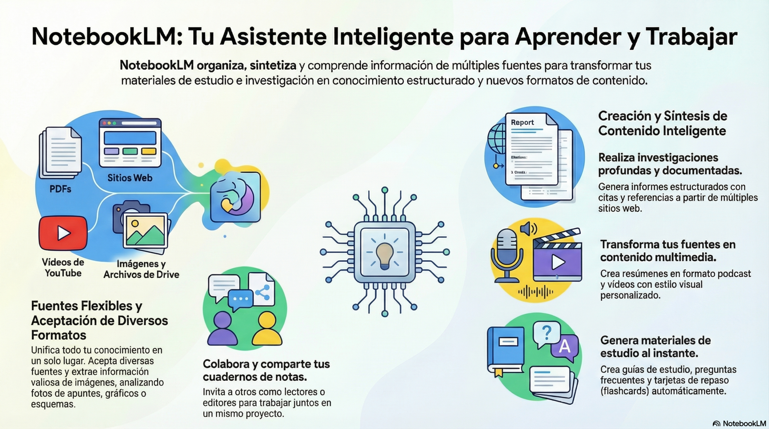NotebookLM se presenta como una herramienta de Google basada en inteligencia artificial diseñada para organizar, sintetizar y comprender información proveniente de múltiples fuentes, actuando como un potente asistente personal de estudio y enseñanza. Sus posibilidades didácticas abarcan desde la investigación profunda hasta la creación de materiales multimedia personalizados.