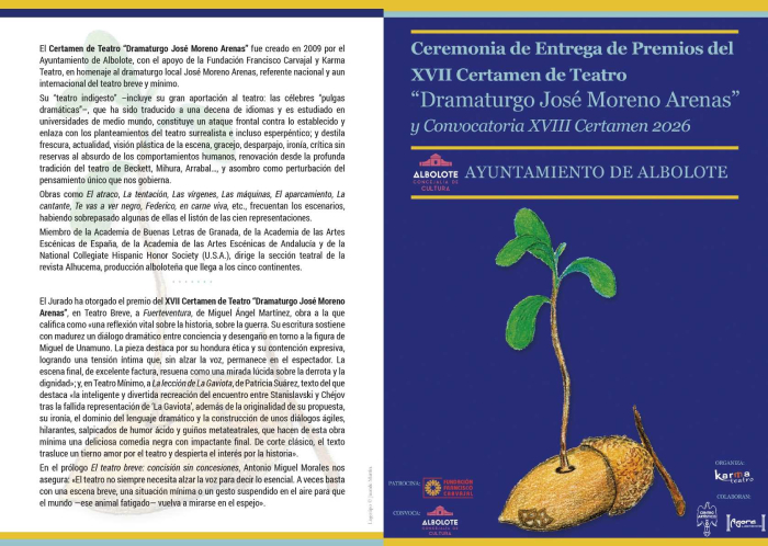 Con asistencia de los autores galardonados –el canario (aunque nacido en Galicia) Miguel Ángel Martínez y la argentina Patricia Suárez–, la Ceremonia de Entrega de Premios del XVII Certamen de Teatro “Dramaturgo José Moreno Arenas” tendrá lugar el viernes 17 de abril, a partir de las siete de la tarde, en el Auditorio del Centro Sociocultural Fernando de los Ríos de la localidad granadina de Albolote. La programación, como en ediciones anteriores, ha sido preparada con todo lujo de detalles.