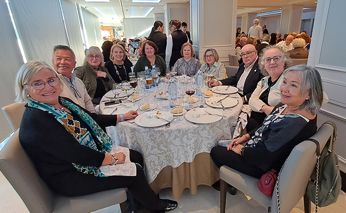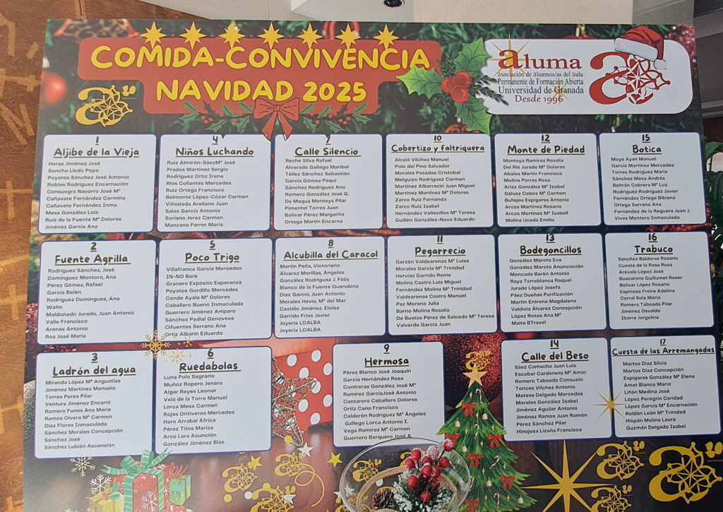 El pasado jueves, 18 de diciembre, 170 socios de ALUMA, la Asociación de Alumnos Mayores del Aula Permanente de Formación Abierta (APFA), celebraba en el Hotel Andalucía Center su comida navideña con la que despedía el primer trimestre del presente curso 2025/2026, con el lema «¡Es tiempo de celebrar juntos!». Igualmente en el cartel de la actividad se indicaba que «en ALUMA celebramos la Navidad compartiendo buenos momentos, buena mesa, baile y abrazos sin fin. ¡Ven a disfrutar la comida de Navidad con nosotros!».