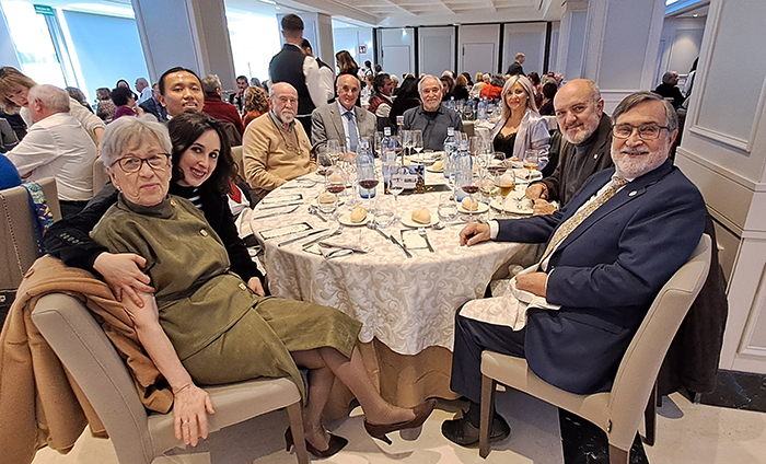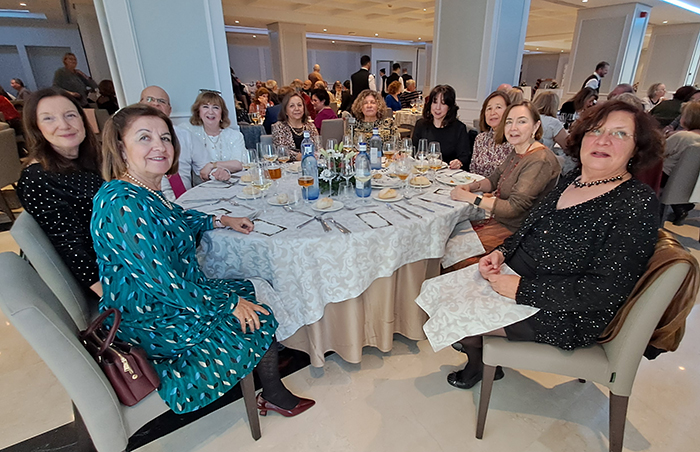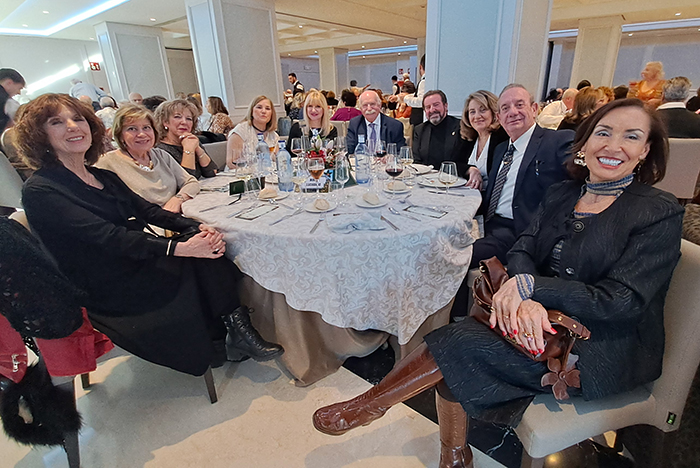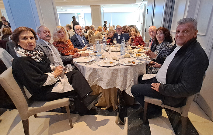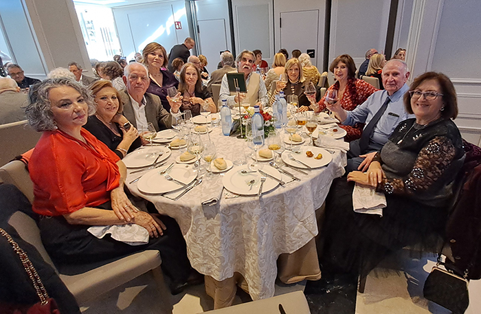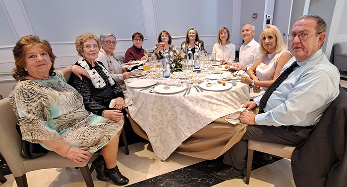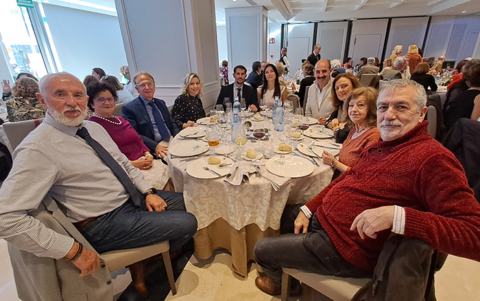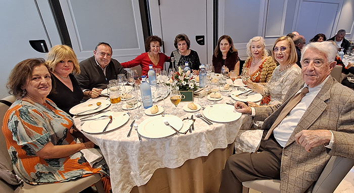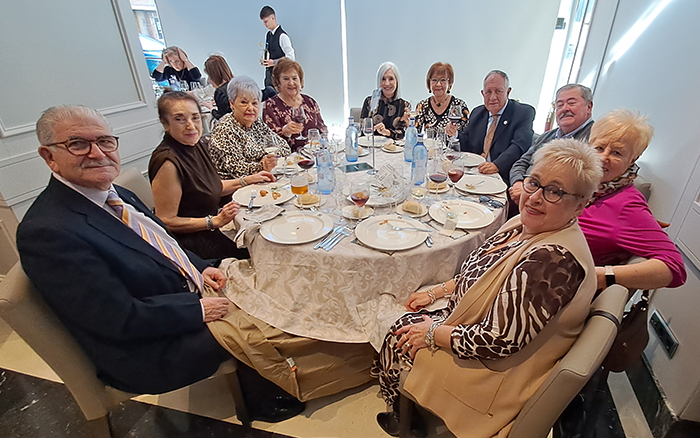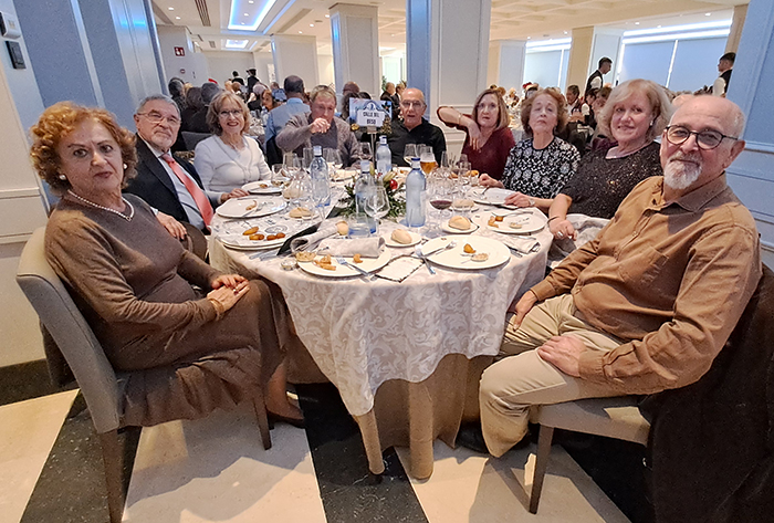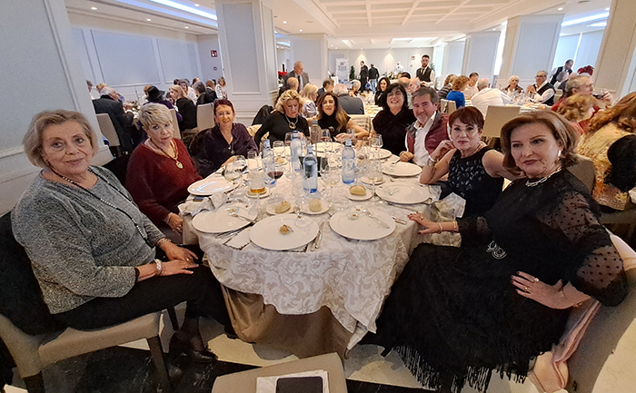 A continuación Rafael Reche repartía la tarjeta con el número para el sorteo de regalos y una vez en el salón unos diligentes camareros comenzaban a repartir la copa de bienvenida, en la que junto a las cervezas, vinos y refrescos, ofrecían crema de salmorejo cordobés, lingotes de queso curado y miel de caña, delicioso pionono con crema de jamón alpujarreño, pastela moruna al estilo andaluz y tartaleta de queso de cabra. Seguidamente los presentes irían tomando su asiento para buena cuenta de los entrantes a base de cazuelita de risotto de trigo marino, gamba gabardina, lágrimas de pollo al natural y deliciosas croquetas rellenas de jamón. A ello siguió el plato principal habiendo elegido previamente entre carne (coidllo de cerdo) o pescado (lubina imperial) regado de buenos vinos o cerveza o refrescos que se remataría con el postre consistente en una semiesfera de ferrero sobre un toffee irlandés. Para el brindis final de todo el grupo una copa de cava brut.