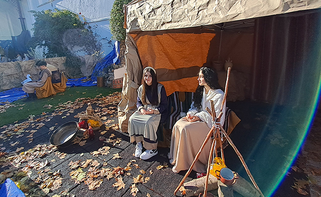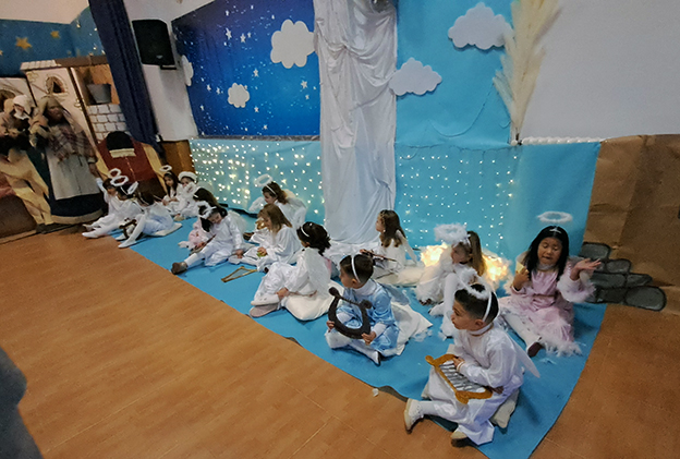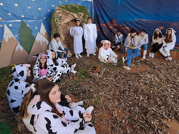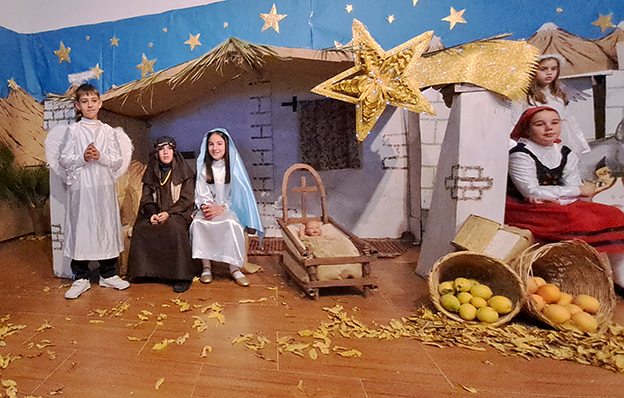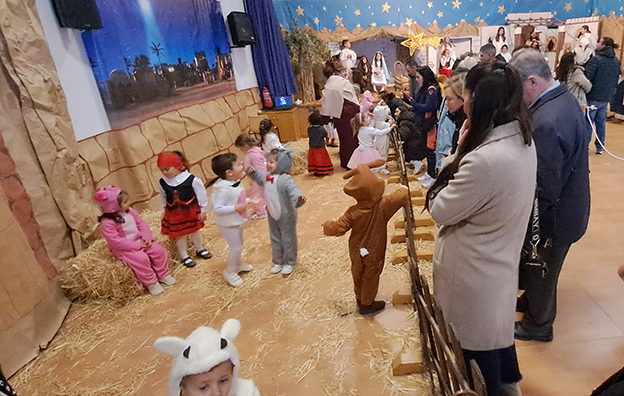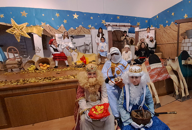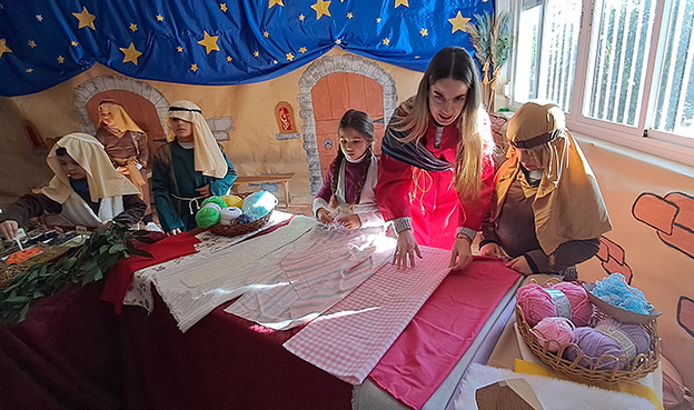 No muy lejos los alumnos mayores muestran la escena de una posada muy animada en la que está muy presente la alegría y la música. «Antes todo estaba en el patio, pero la experiencia de otros años y el frío ha que hecho que a los más chiquitillos los metamos dentro pues pasaban mucho frío y hemos ido buscando lugares más resguardados en el colegio», explica Daniel mientras avanzamos y dejamos atrás el montaje a modo de photocall para que quien lo desee pueda llevarse un recuerdo. Como es normal las familias se agolpan en los espacios donde están los más pequeños.