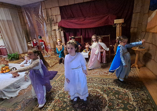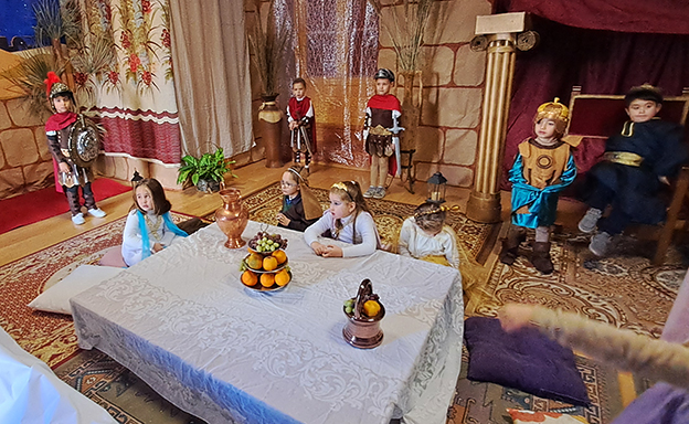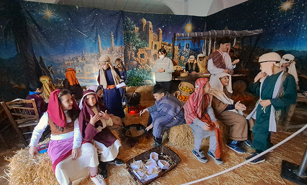 Volvemos de nuevo al interior y nos encontramos a los alumnos de Infantil en la escena del castillo de Herodes momento que aprovecha Daniel para agradecer la implicación de la familia y también del Ayuntamiento que les cede los puestos de madera ayudando con ello a que la actividad sea más vistosa. En este trayecto nos volvemos a encontraba con Lourdes, la directora pedagógica del centro que resalta el trabajo de toda la comunidad educativa, «que es lo que más nos gusta a nosotros porque es un momento en el que todo el profesorado se aúna, incluso la familia se aúna para sacar este proyecto adelante. Luego, pues tiene mucha repercusión, sobre todo en los niños pues es muy importante que vean otra Navidad distinta, no solamente la Navidad de los grandes comercios y que muchas veces lamentablemente ya en las casas en muchas familias no se ve y de cara al pueblo, pues también es muy importante el que el colegio La Purísima se haga visible, nos vean cómo trabajamos, vean nuestras instalaciones, conozcan al profesorado y nos hacernos cercanos al pueblo que estamos aquí para lo que necesiten los demás».