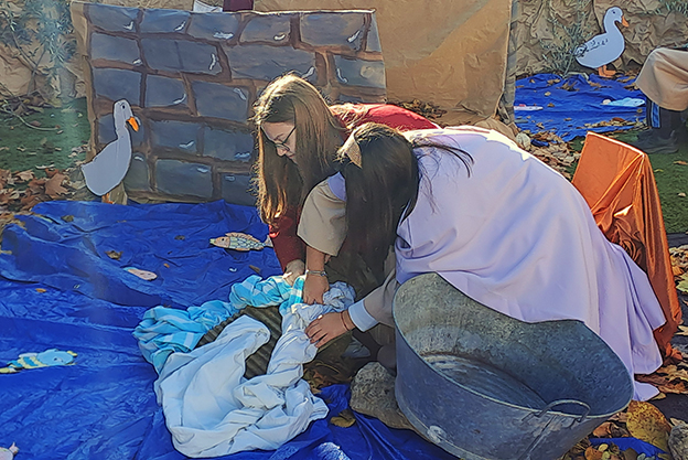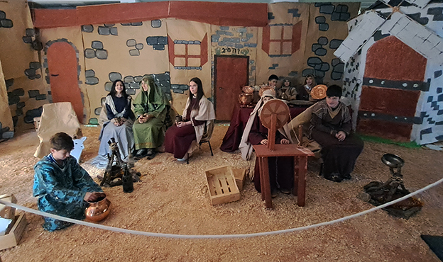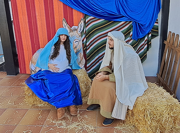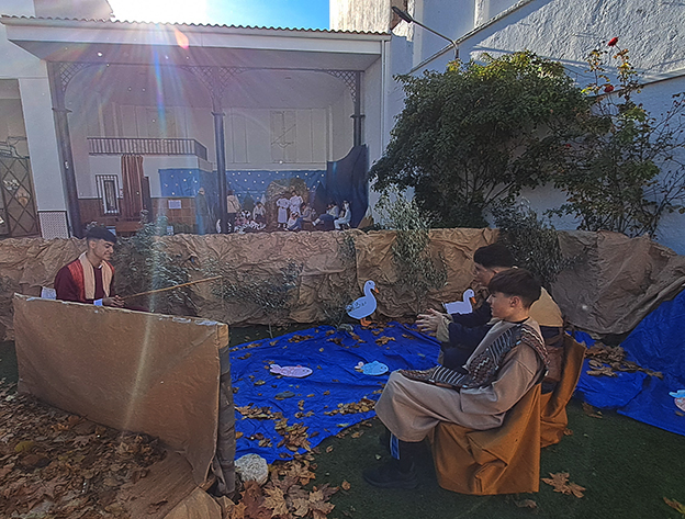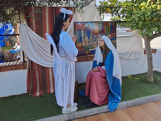 «Durante estos dos días nos van a ir visitando miembros de de los distintos centros educativos de la localidad. Vienen también usuarios de las residencias de ancianos. Algunos de nuestros alumnos mayores han ido a buscarlos para acompañarlos y que puedan visitar nuestro Belén. también vienen de las guarderías de de la zona. Muchas maestras y directoras han manifestado que quieren traer a sus alumnos con su familia a ver el Belén», explica en tanto nos acercarnos al primer grupo que escenifica el anuncio a los pastores, seguimos con el ángel que anuncia a los pastores que van a hacer el Salvador y cuyas escenas están representadas por alumnado de Secundaria. En otro espacio podemos contemplar a los pescadores y lavanderas y en enfrente la escena de la Anunciación a María. También nos encontramos con José y a María camino de de Belén haciendo una parada.