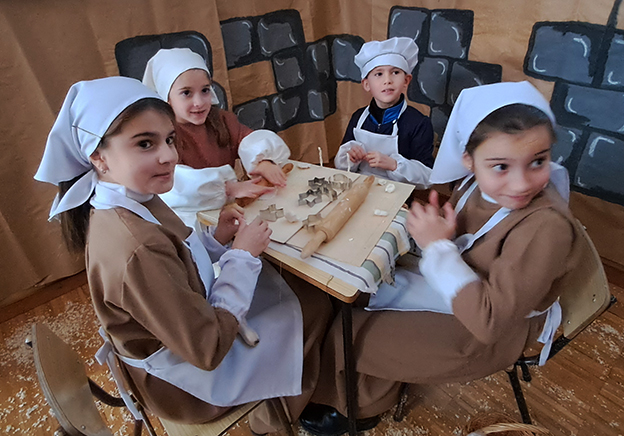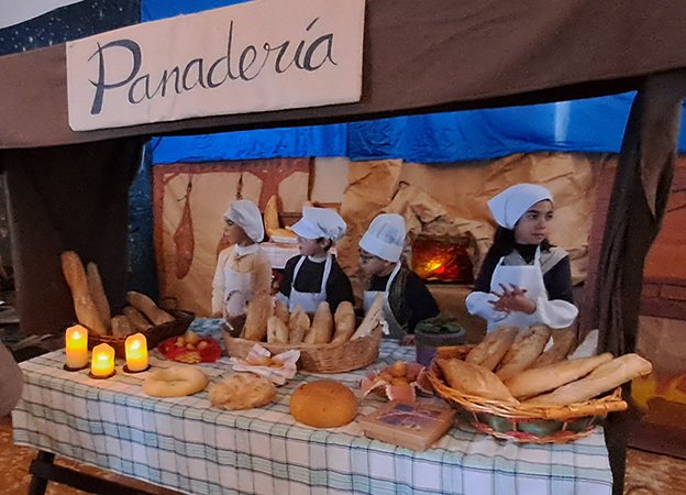 Ya en el gimnasio nos encontrarnos con alumnos convertidos en panaderos que le confirman a Daniel que están disfrutando con lo que están haciendo. Isabel lleva tan solo cuatro meses y por lo tanto es la primera vez que contempla este Belén viviente lo cual califica de «experiencia maravillosa. Es una gozada lo que estoy disfrutando. Además, me han informado los profesores de otros año y es una maravilla vivir este ambiente aquí en La Purísima. Así que muy agradecida por todas las enseñanzas que nos están dando este colegio». Atrás dejamos la carnicería donde se afanan con las salchichas y chorizos o un poco más allá con la preparación de las típicas migas. Además de los profesores, Daniel comenta que en este proyecto también se implican los prácticos, algunos de los cuales son antiguos alumnos como es el caso de Hugo que se ha implicado, junto con el resto, y manifiesta estar encantado en tanto que Daniel manifiesta que es una alegría que un antiguo alumno vuelva a hacer prácticas aquí cuando hacen su carrera y que se impliquen de esta manera.