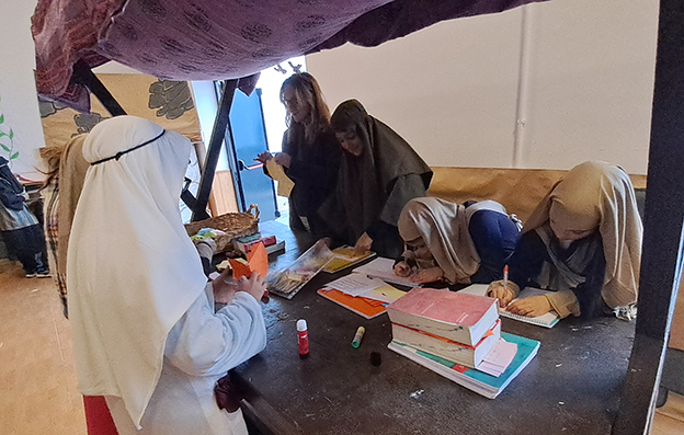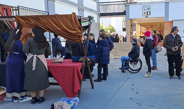 Por si esto fuera poco también indica que por las tardes la Asociación de Madres y Padres (AMPA) del colegio ofrece chocolate con churros. Más adelante nos encontramos con los participantes en la escena del mercado en el que se lo pasan de lo lindo los más pequeños de Primaria mientras nos comenta que la preparación del Belén se remonta a un par de meses atrás y que es posible gracias a la implicación del profesorado y alumnado pero también de las familias pues muchos papás y mamás han venido a echar una mano en algunos momentos. Lo que estáis viendo ahora es porque el AMPA ha hecho también un concurso de belenes. Entonces, las familias han hecho con materiales reutilizados, todo manual, diferentes diferentes belenes para para ir preparando y ambientando el espíritu navideño. Tenemos por aquí adornos de Navidad que han hecho una actividad también los alumnos con el AMPA y con algunas familias los adornos navideños», señala mientras recorremos distintos puestos una vez regresados al patio.