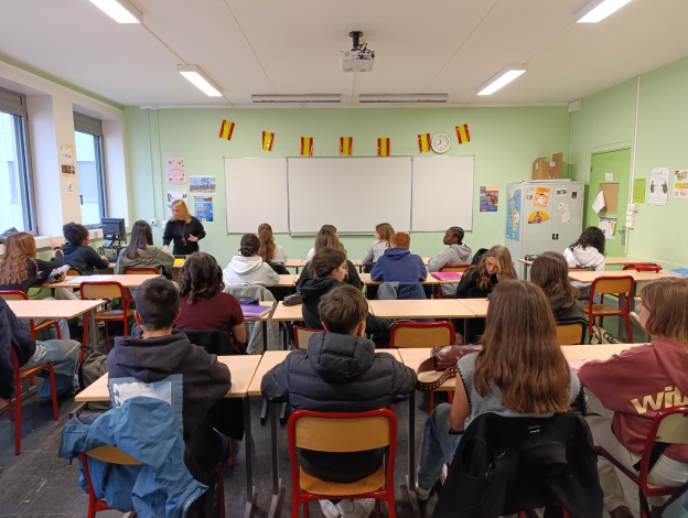 La profesora Élodie nos invitó a asistir a su clase de español con los alumnos franceses y sorianos que estaban a punto de despedirse de su intercambio. Tras presentarnos observamos una clase dinámica de español. Tras esta pudimos conocer al equipo directivo del centro (director, vicedirectora y secretaria). El acceso a estas plazas es mediante oposición.Todos vivían con sus familias en el propio centro, que cuenta con varios apartamentos, incluso dispone de uno para las estancias de otros profesores. Curioso.