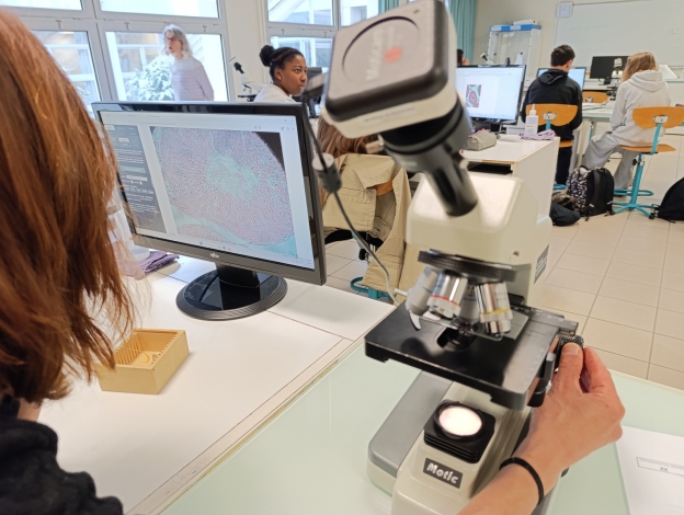 La mañana del jueves 26 de marzo pudimos observar cómo un grupo de alumnos de 1º Bachillerato realizaba una práctica de Biología en la que pudieron observar un corte de testículo humano y aprender la importancia de la testosterona en la formación del sexo del feto, así como en la producción de espermatozoides. Cada pareja de alumnos disponía de un microscopio acoplado a un monitor en el que podían ver la preparación. Gracias a las explicaciones de la profesora la llevaron a cabo satisfactoriamente.